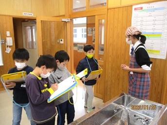 【献立掲示と楽しみに掲示を見ている下級生】