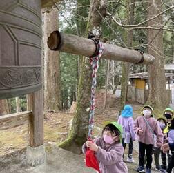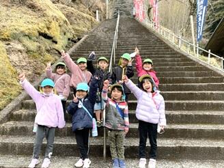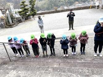 27日(木)は全長寺の鐘つき堂までの石段登りに挑戦しました。365段あり、最後まで登り切れるか心配していたのですが、終始笑顔の中、なんと10分間で全員登り切りました。一人一人鐘をついて、火災がおきないように願いました。