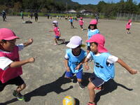 10月6日(金)に西郷幼稚園で3園交流があり、ヴェロスクロノス都農の方が見えて、サッカー教室が行われました。ボールと友だちになるために、高く投げてキャッチしたり、ドリブルでお散歩したりと夢中になって取り組みました。最後は、年中・年長に分かれてサッカー対決。ですが、ボールは1つではなくいくつもあるんです!あっちにいったりこっちにいったりとボールを追いかける子ども達はとても活き活きしていましたよ。