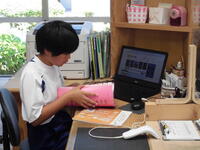 その後は学校へ帰り、室内で遊んだあと、いよいよお昼、楽しみにしていたお弁当。幼稚園児と一緒に多目的スペースでシートを敷いて食べました。遠足気分が少しあがった上に、愛情たっぷりのお弁当を目の前に、本当に嬉しそうでした。