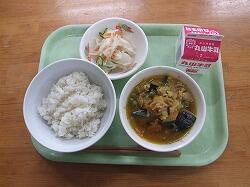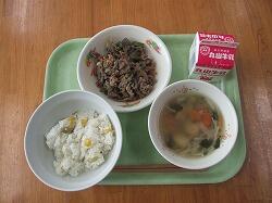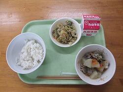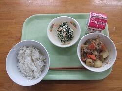 月曜日の給食のメニューは、麦ごはん、キムチーズ肉じゃが、豆腐の梅肉和えです。