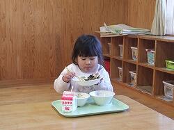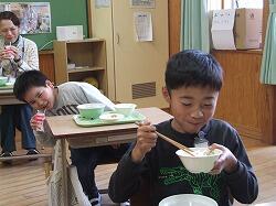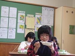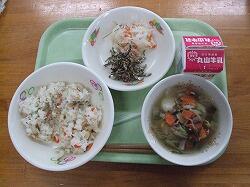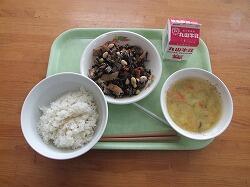 〇給食のメニューは、麦ごはん、大豆の五目煮、貝割れ菜のすまし汁でした。