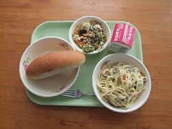 〇給食のメニューは、ミニコッペパン、クリームスパゲティ、海藻サラダでした。