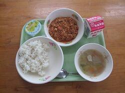 〇給食のメニューは、タコライス、野菜スープ、日向夏みかんゼリーでした。