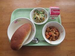 明日の給食のメニューは、ミルクパン、ポークビーンズ、ブロッコリーサラダです。