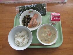 〇給食のメニューは、麦ごはん(おにぎりのり)、鮭の塩焼き、高菜の炒め物、栄養すいとん汁でした。
