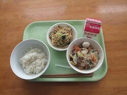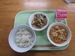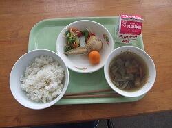 〇給食のメニューは、麦ごはん、野菜と肉団子の煮物、きゅうりとわかめの酢の物でした。