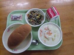 明日の給食のメニューは、コッペパン(メープルジャム)、クリームシチュー、ひじきとごぼうのサラダです。