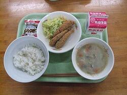 〇給食のメニューは、麦ごはん、シイラフライ・ソース、里芋のすり流し汁でした。