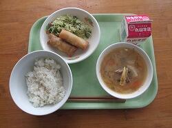 月曜日の給食のメニューは、麦ごはん、春巻き(ゆかり和え)、キムチ汁です。