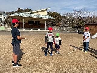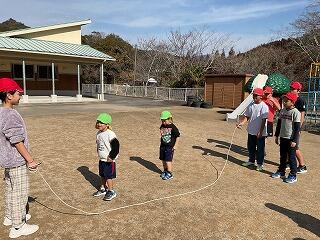 事前に5年生が話し合った結果、「ジェスチャーゲームとボール落としゲーム、長縄」を行いました。幼稚園児が喜ぶよう、5年生が手加減したり、アドバイスしたりする姿が見られました。