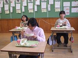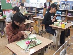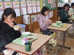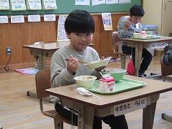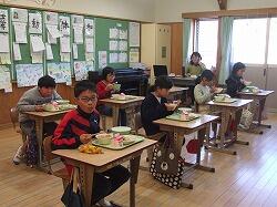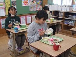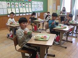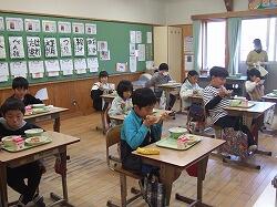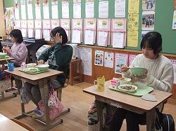 1年生の教室で幼稚園生が一緒に給食を食べました。