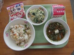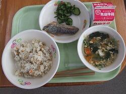 〇給食のメニューは、炊き込みごはん、さばの味噌煮、小松菜とわかめのしらす和え、かき玉汁でした。