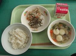 月曜日の給食のメニューは、麦ごはん、煮魚こんにゃく、小松菜の味噌汁です。
