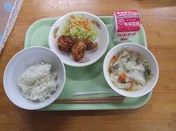 〇給食のメニューは、麦ごはん、鶏肉の唐揚げ、かぼちゃの味噌汁でした。