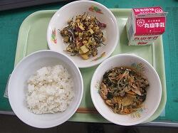 〇今日の給食のメニューは、麦ごはん、大豆の五目煮、茎わかめの酢の物でした。