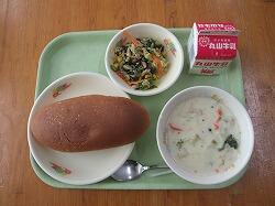 明日の給食のメニューは、ミニ黒糖パン、クリームスパゲティ、海藻サラダです。しかし、ミニ黒糖パンがコップペンに変更になります。