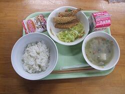 月曜日の給食のメニューは、麦ごはん、魚の変わり揚げ、えのきと揚げの味噌汁です。
