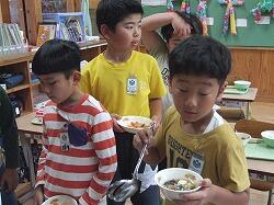 〇給食のメニューは、セルフドッグ、キャロットポタージュスープでした。
