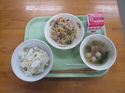 〇給食のメニューは、とうもろこしと枝豆のごはん、つくね団子スープ、千切り大根の炒め煮でした。