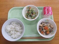 〇給食のメニューは、麦ごはん、鶏肉と里芋の含め煮、きゅうりとわかめの酢の物でした。