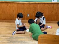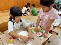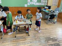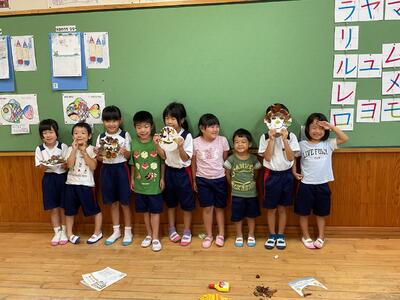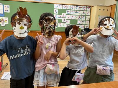 校庭に落ちていた落ち葉でお面を作りました。幼稚園生も一緒に活動し、1年生が「どの葉っぱ使いたい?」「ここに貼る?」など優しく聞きながら接していました。休み時間には完成したお面を色んな先生たちに見せて驚かせていた1年生でした!
