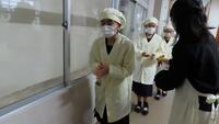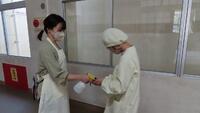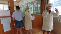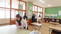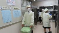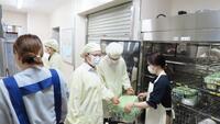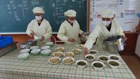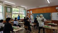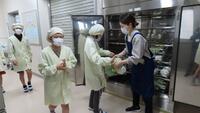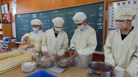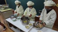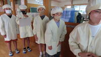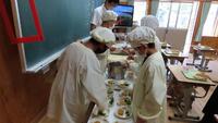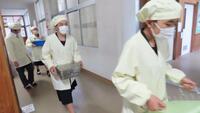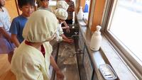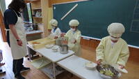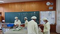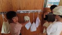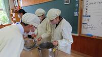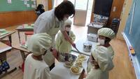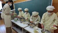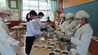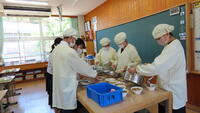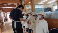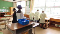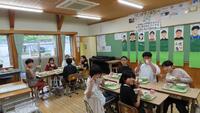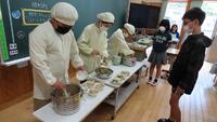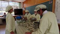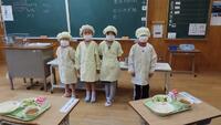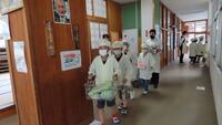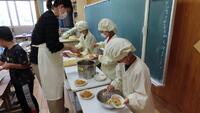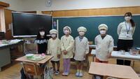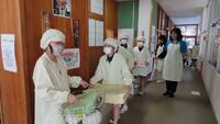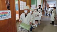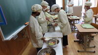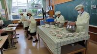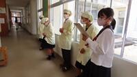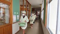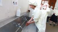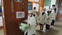 給食準備では、手をしっかり洗い、給食着を着た後、つめが伸びていないか等の確認をしてから給食室に向かいます。配膳もスムーズにできるようになってきました。
