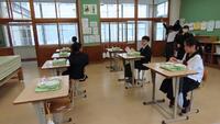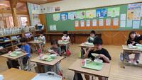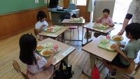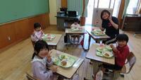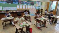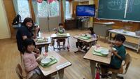 今日から1年の給食がスタートしました。自分たちで上手に配膳できました。