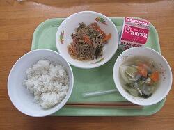 〇給食のメニューは、麦ごはん、いわしの梅煮(たたききゅうり)、豆腐団子汁でした。