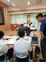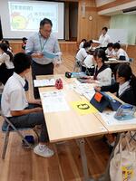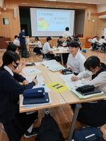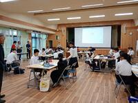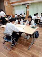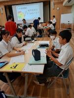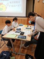 9年生がバスでNHCに移動し、西郷義務教育学校、南学園と合同で社会科の授業を受けました。美郷町の財政について考えました。