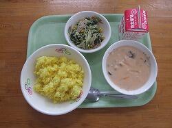 〇今日の給食のメニューは、ターメリックライスのクリームソースがけ、ほうれん草サラダでした。
