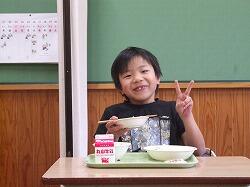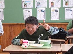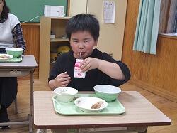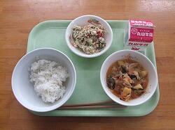月曜日の給食のメニューは、麦ごはん、キムチーズ肉じゃが、豆腐の梅肉和えです。