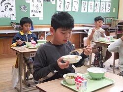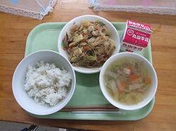 〇今日の給食のメニューは、麦ごはん、春雨のオイスターソース炒め、白菜とじとっこのスープでした。