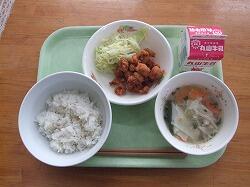 明日の給食のメニューは、麦ごはん、鶏肉の唐揚げ、えのきと揚げの味噌汁です。