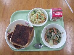 〇今日の給食のメニューは、ココアトースト、麦と野菜のスープ煮、日向夏ドレッシングサラダでした。