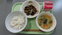 【今日のメニュー】麦ごはん、ひじきベーコン、ごぼう団子のみそ汁