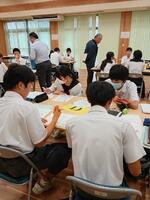 9年生がバスでNHCに移動し、西郷義務教育学校、南学園と合同で社会科の授業を受けました。美郷町の財政について考えました。