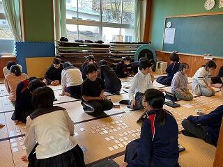 12月23日(火)5・6校時、世間はイブイブだと言ってクリスマスムードですが、本校では百人一首大会が盛大に行われました。手札を読んでいる時にはシーンと静かになり、手札を取ったときに、「ギャー」や「あー」などの叫び声が聞こえ、とても白熱した大会となりました。