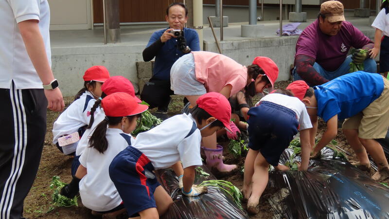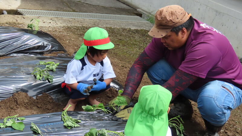 幼稚園・小学1年・2年でいもの苗植えを行いました。