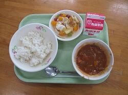 明日の給食のメニューは、ハヤシライス、フルーツ杏仁です。