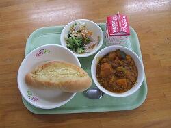 〇給食のメニューは、マヨネーズパン、かぼちゃのミートソース煮、花野菜サラダでした。