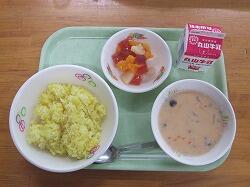 〇給食のメニューは、ターメリックライスのクリームソースかけ、フルーツカクテルでした。