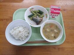 明日の給食のメニューは、麦ごはん、さばの生姜煮(たたききゅうり)、もやしの味噌汁です。
