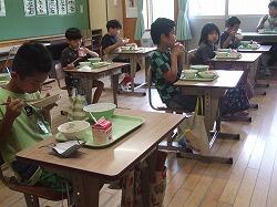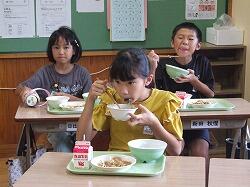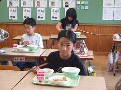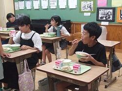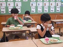 明日の給食のメニューは、豚とじ丼、千切り大根の酢の物です。