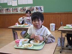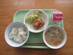 〇給食のメニューは、麦ごはん、とんかつ(ゆでキャベツ)、もやしの味噌汁でした。