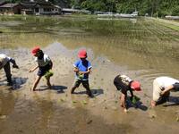 5年生が、甲斐栄さんの田んぼをお借りして田植えを体験させていただきました。今日は天候もよく、一生懸命植え、作業スピードも速く、とても上手に植えることができました。甲斐さん、ありがとうございました。