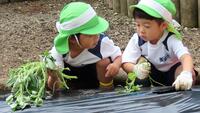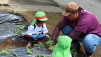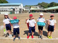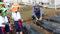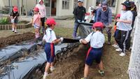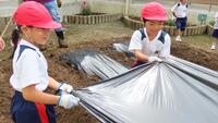 本日、2校時目に幼稚園から2年生の園児・児童が、いもの苗植えを行いました。JA青年部の方々にご指導いただきながら、マルチはりや苗植えを行いました。秋の収穫に向けて、これからお世話を頑張ってほしいと思います。