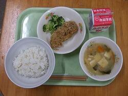 〇今日の給食は、麦ごはん、ホキフライ、豆腐の味噌汁でした。