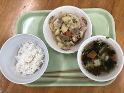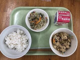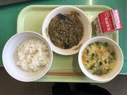 今日の給食は、麦ごはん、麻婆茄子、にら玉スープでした。