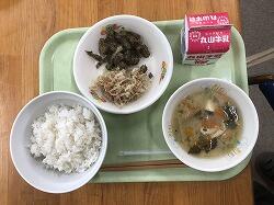 今日の給食は。麦ごはん、さんまのおかか煮、豆腐団子汁でした。